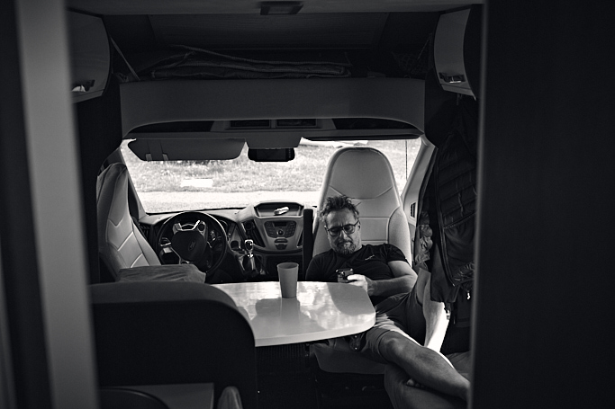 The three of us headed out for the calendar shoot: photographer Richard Nowak, me as an assistant and backstage photographer, and Přemek Fejfar as assistant — all in a camper van.